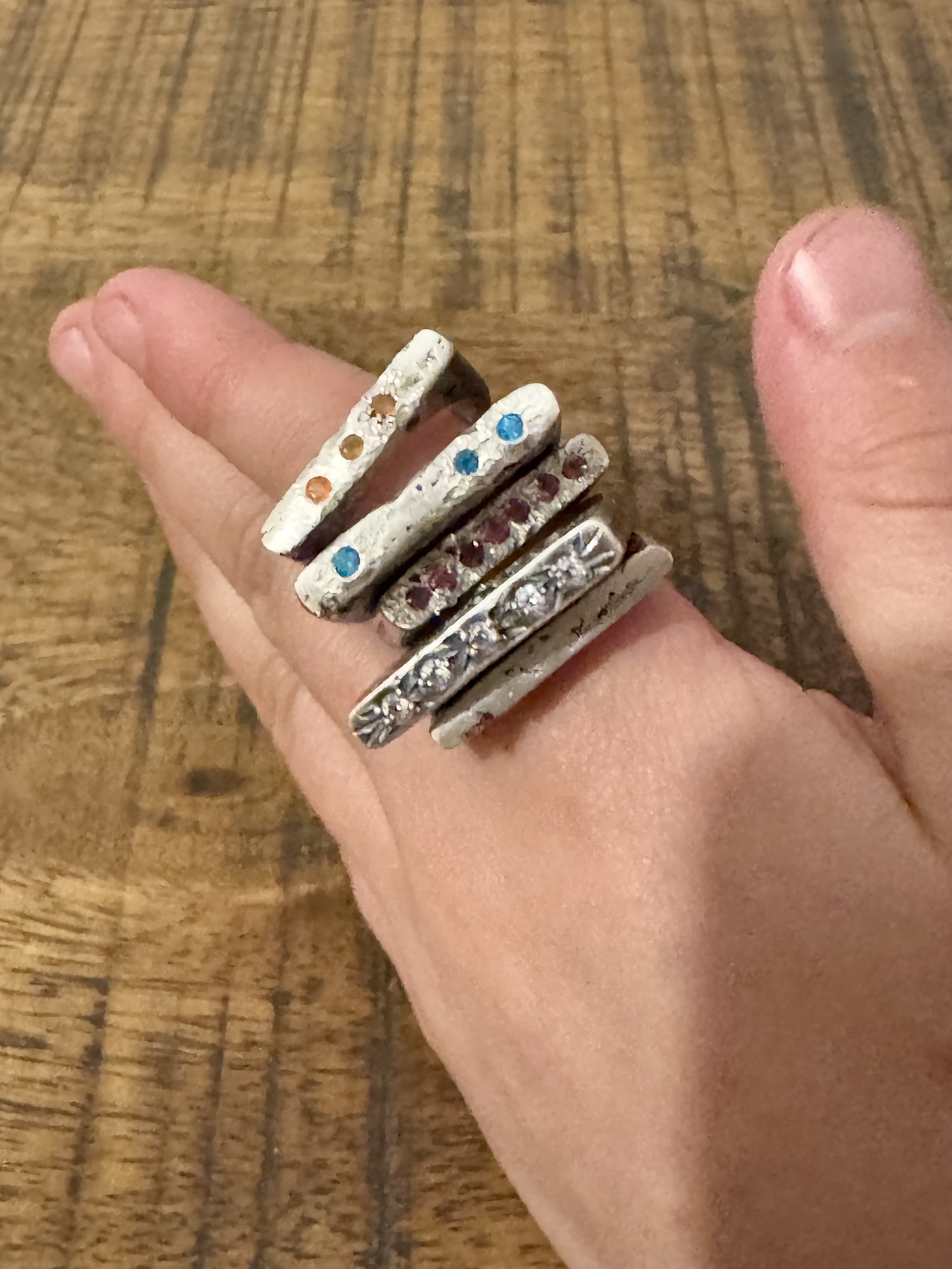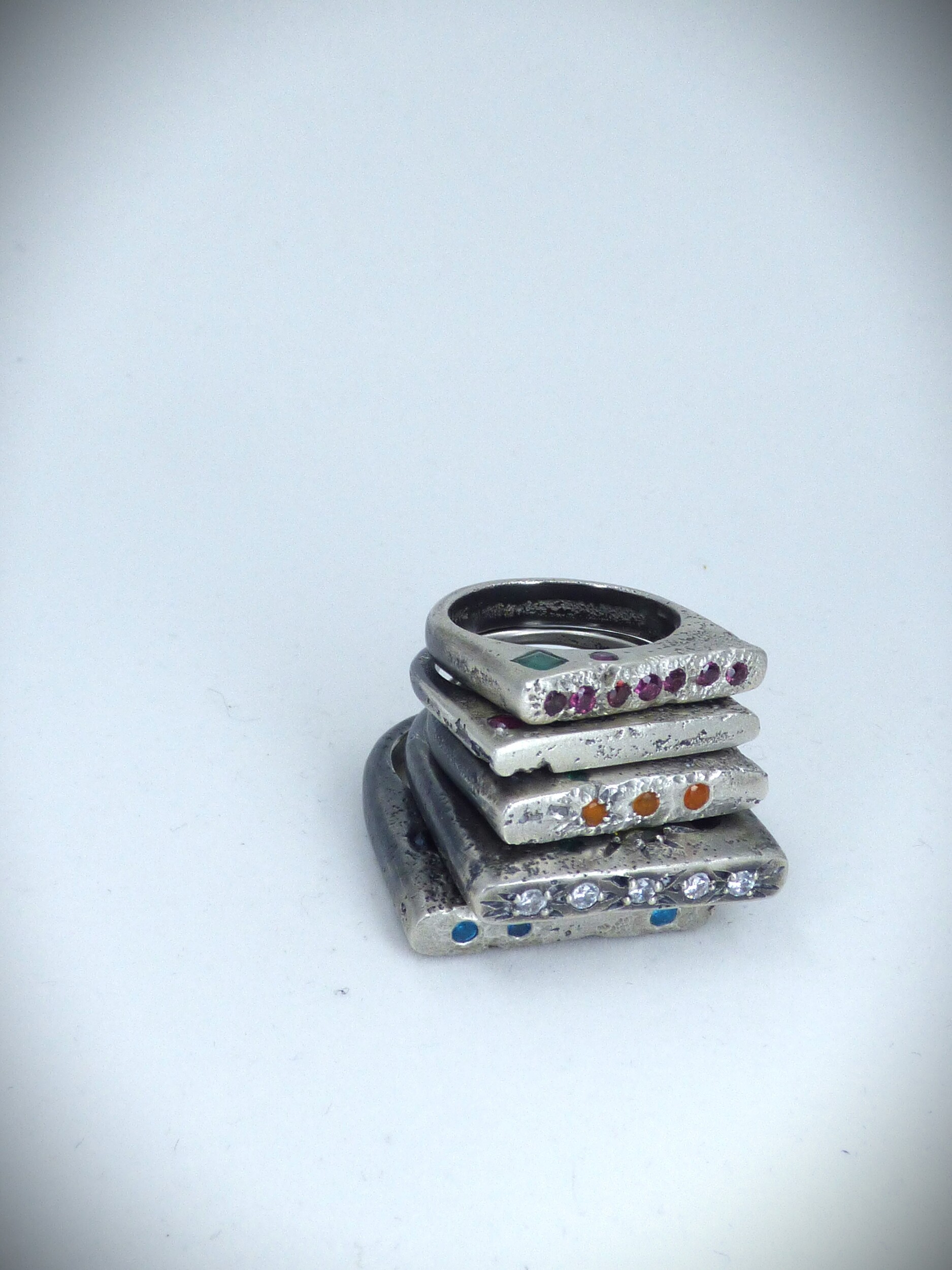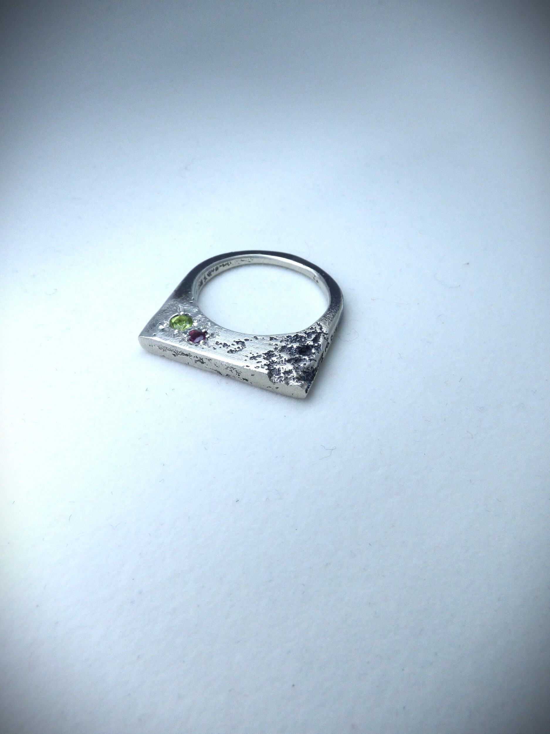 This Urban Decay slice ring has been textured and sand cast in 925 sterling Silver with Gems in place giving the unique organic look to the settings.