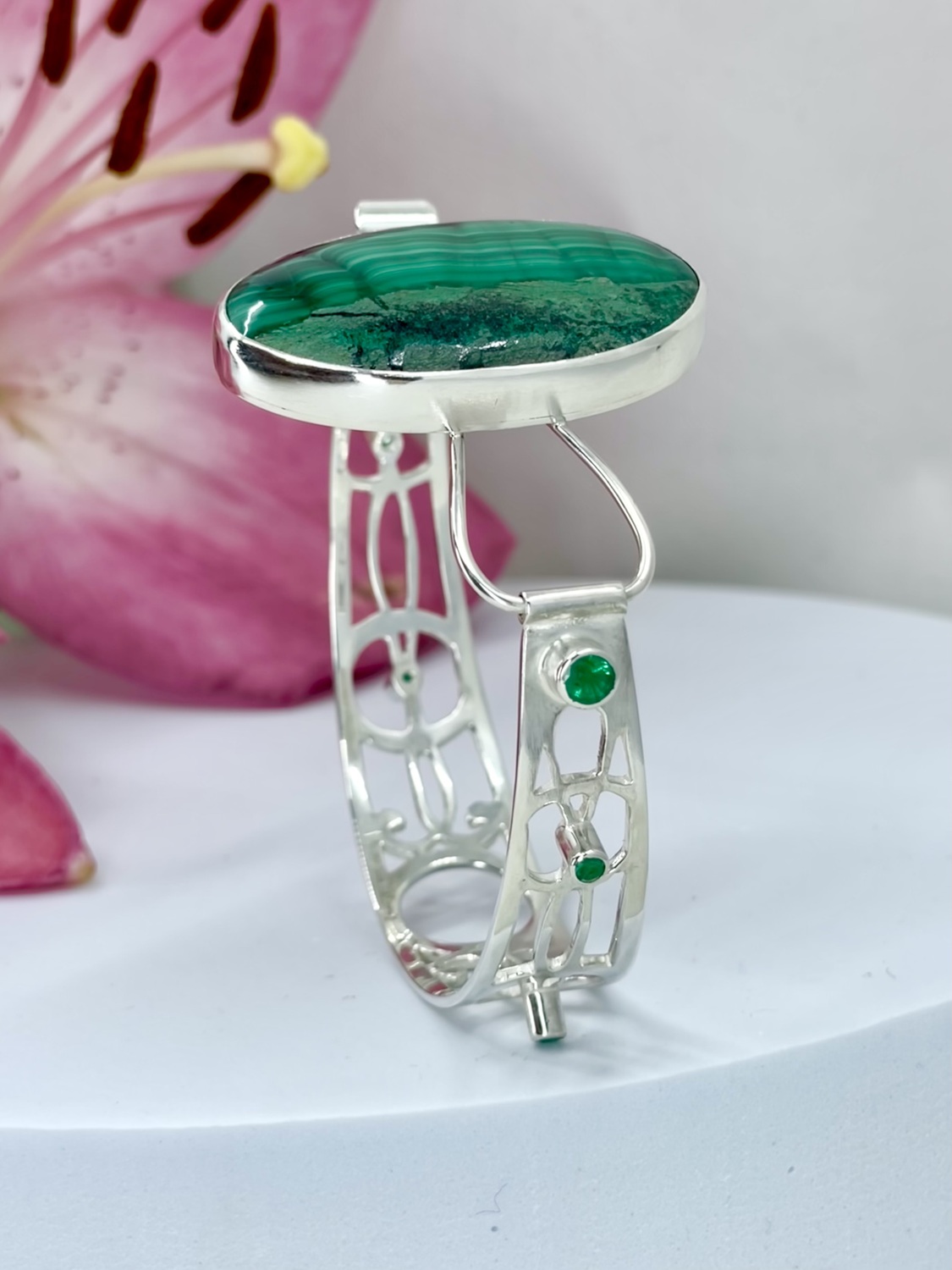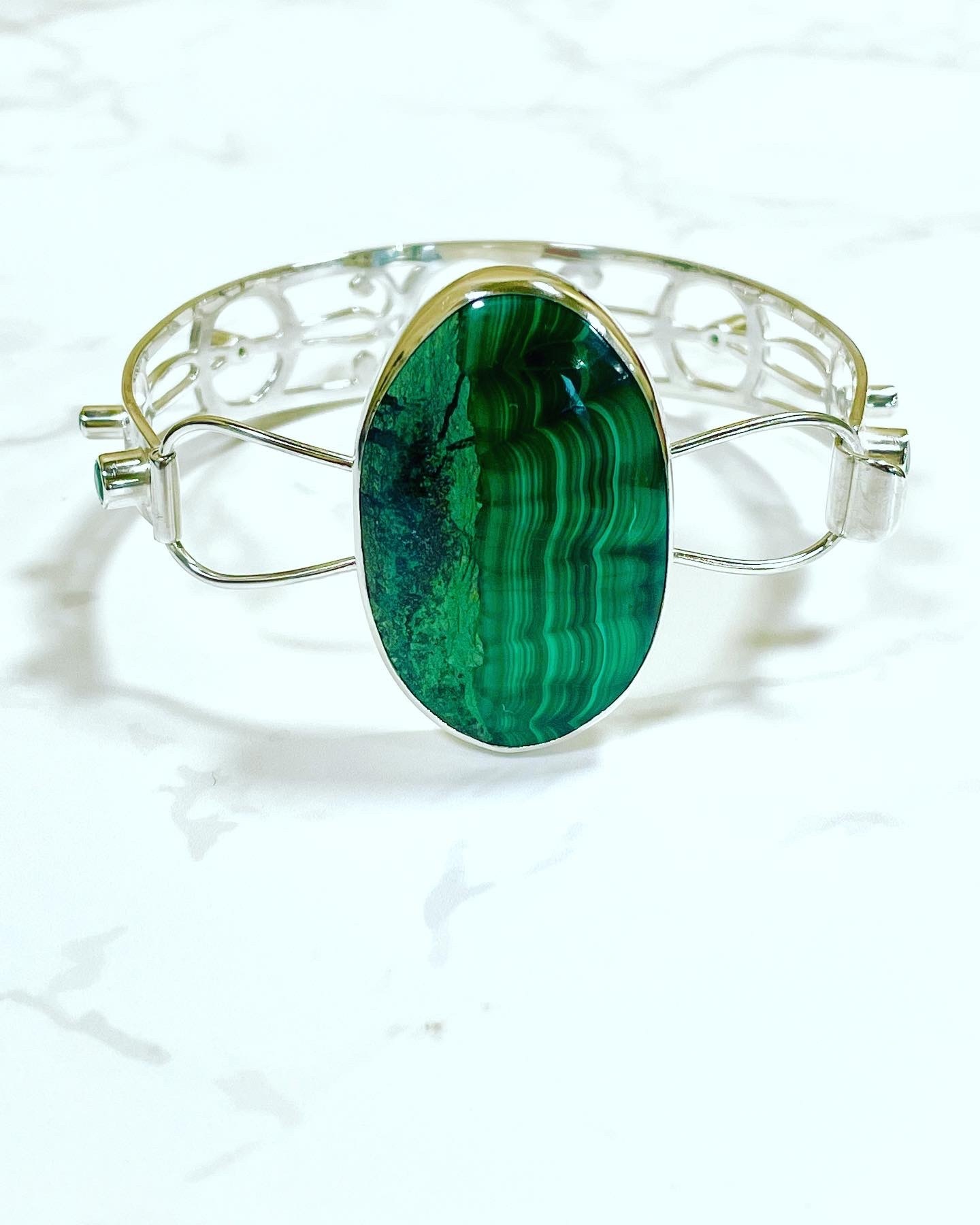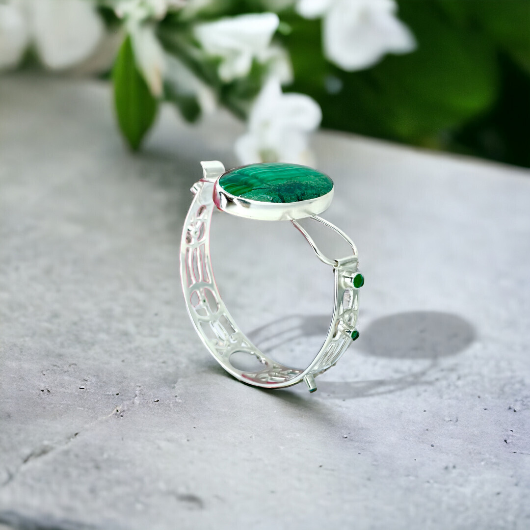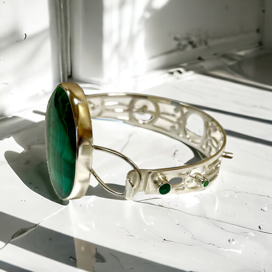 The impressive Malachite, Is showcased and held in a 925 Sterling Silver, hand built torque bangle, studded with dazzling Emeralds.