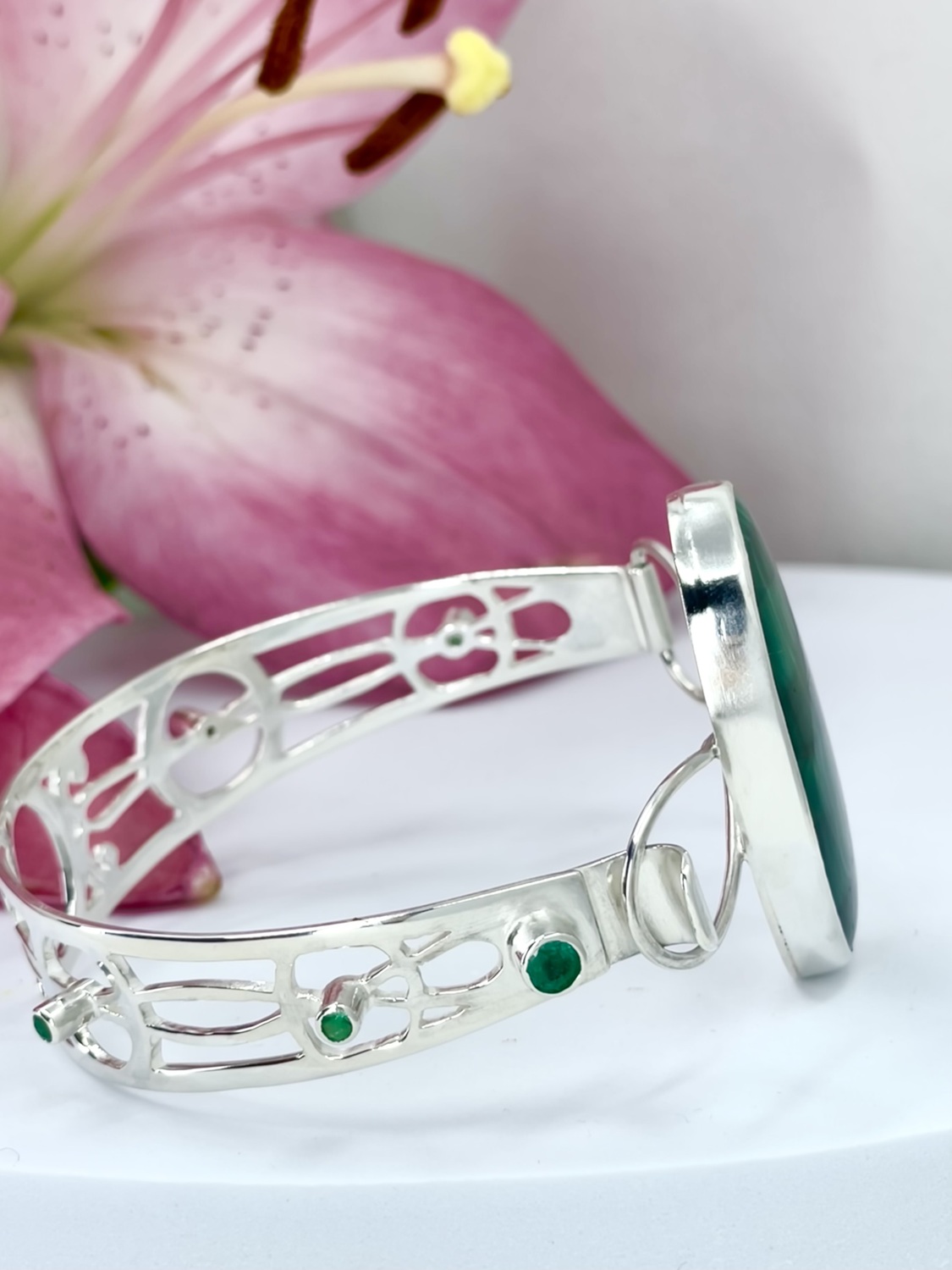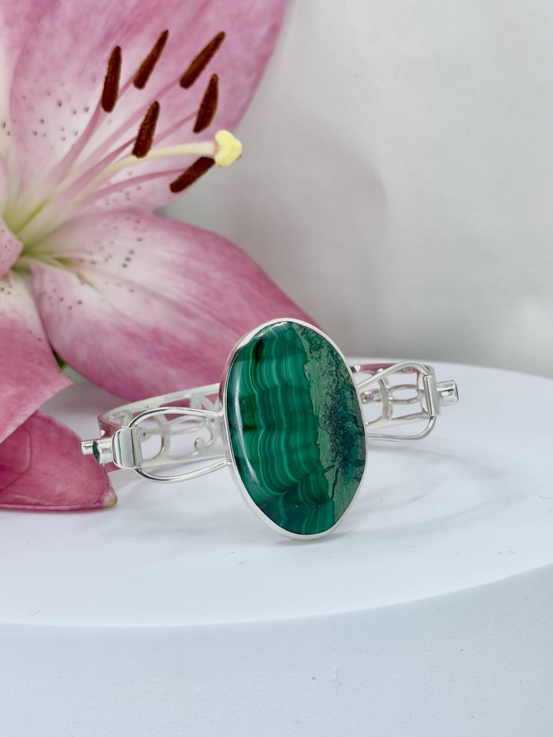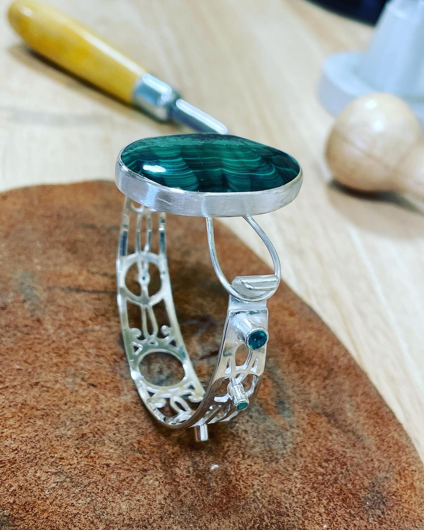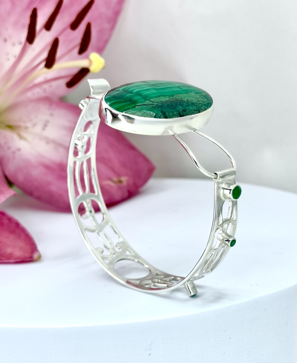 The impressive Malachite, Is showcased and held in a 925 Sterling Silver, hand built torque bangle, studded with dazzling Emeralds.