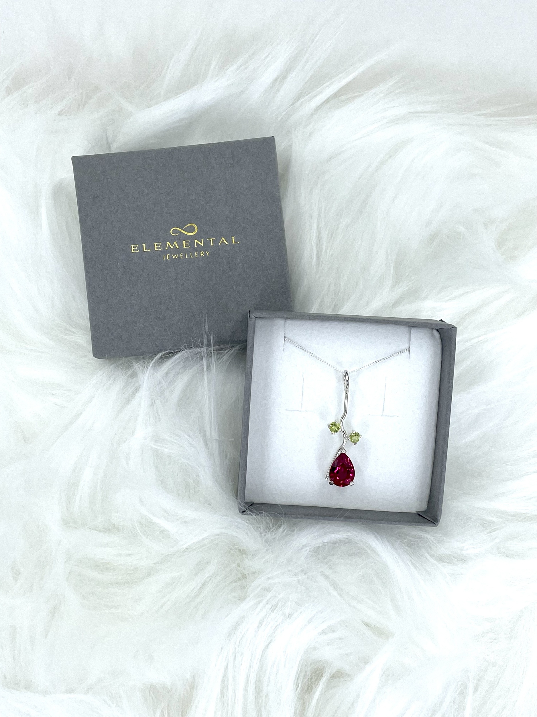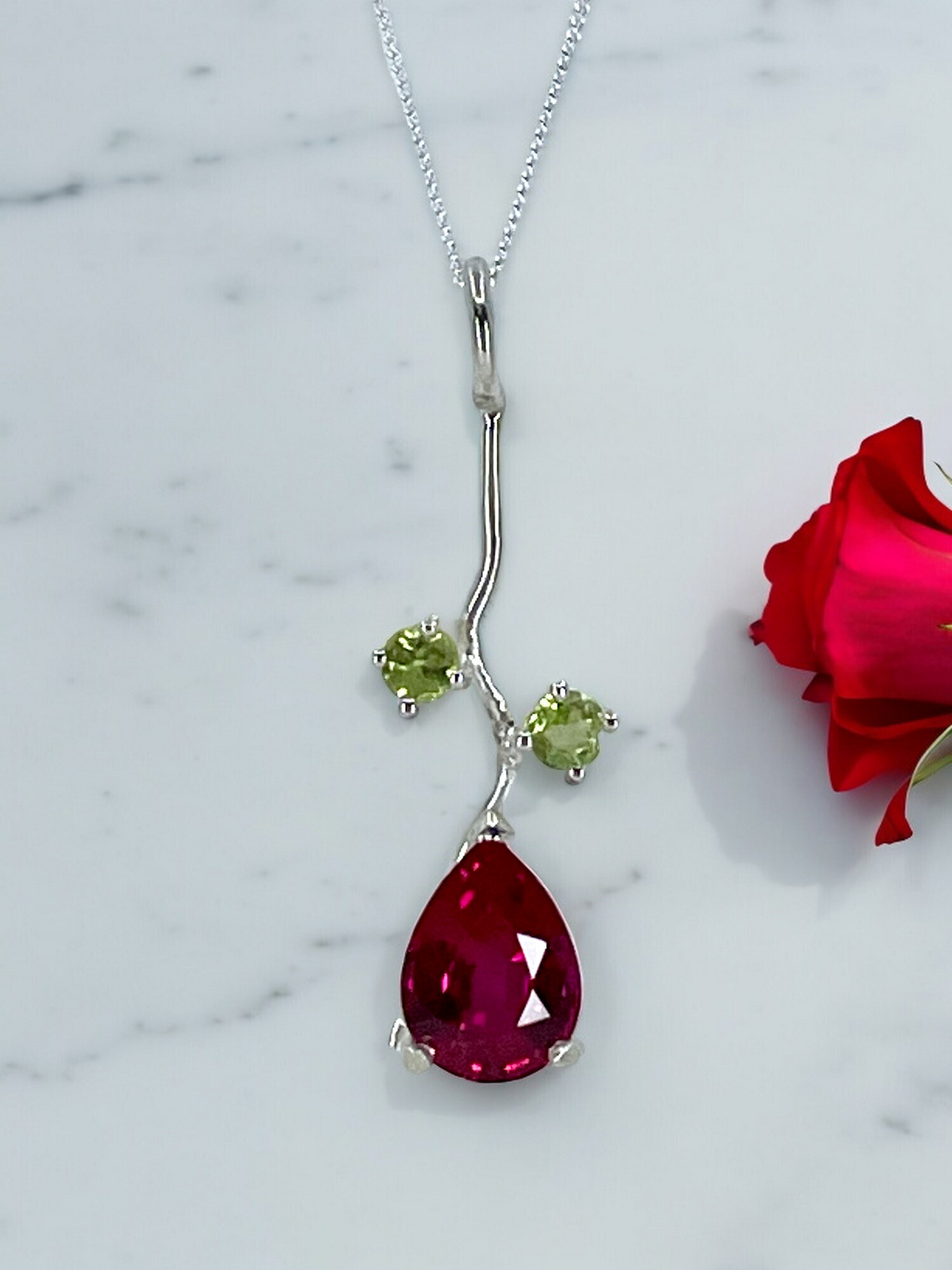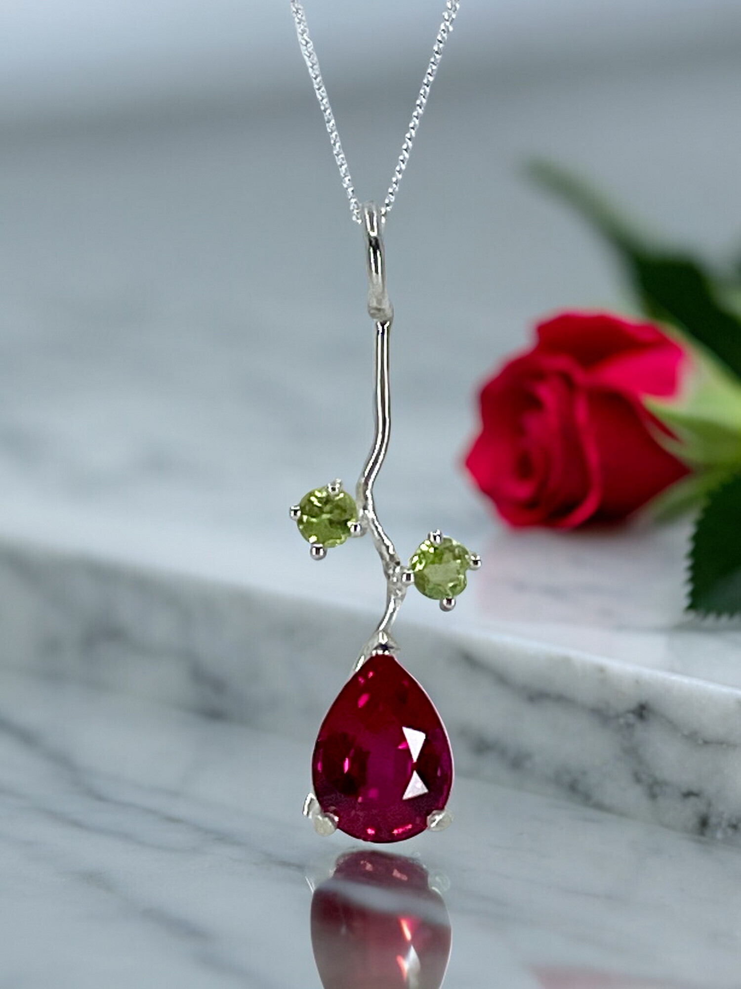 This seductively elegant -'Timeless' Teardrop Deep Red Natural Ruby & Peridot , sterling silver claw set pendant with chain, is a delicate rose design to signify the single rose given as a symbol of love.