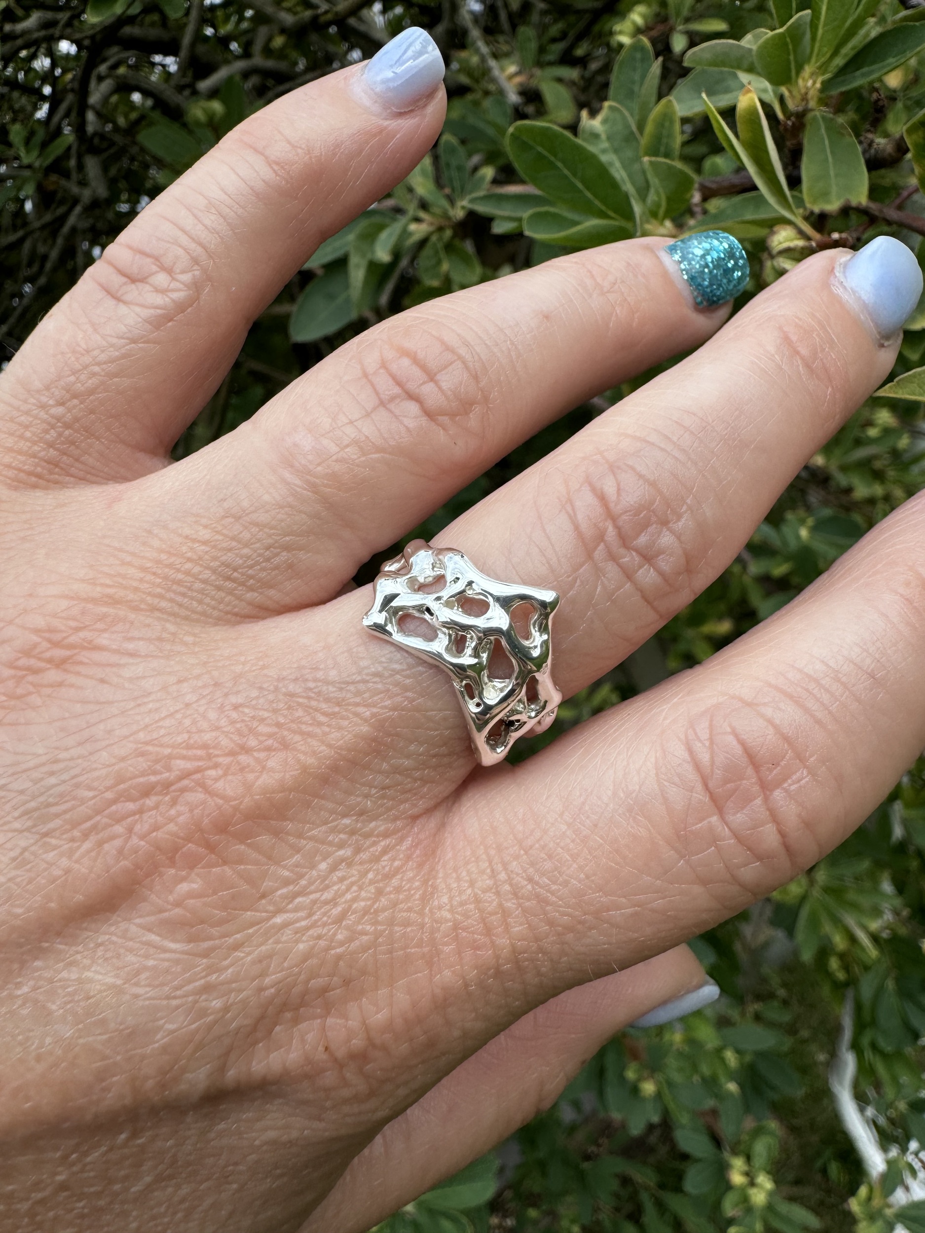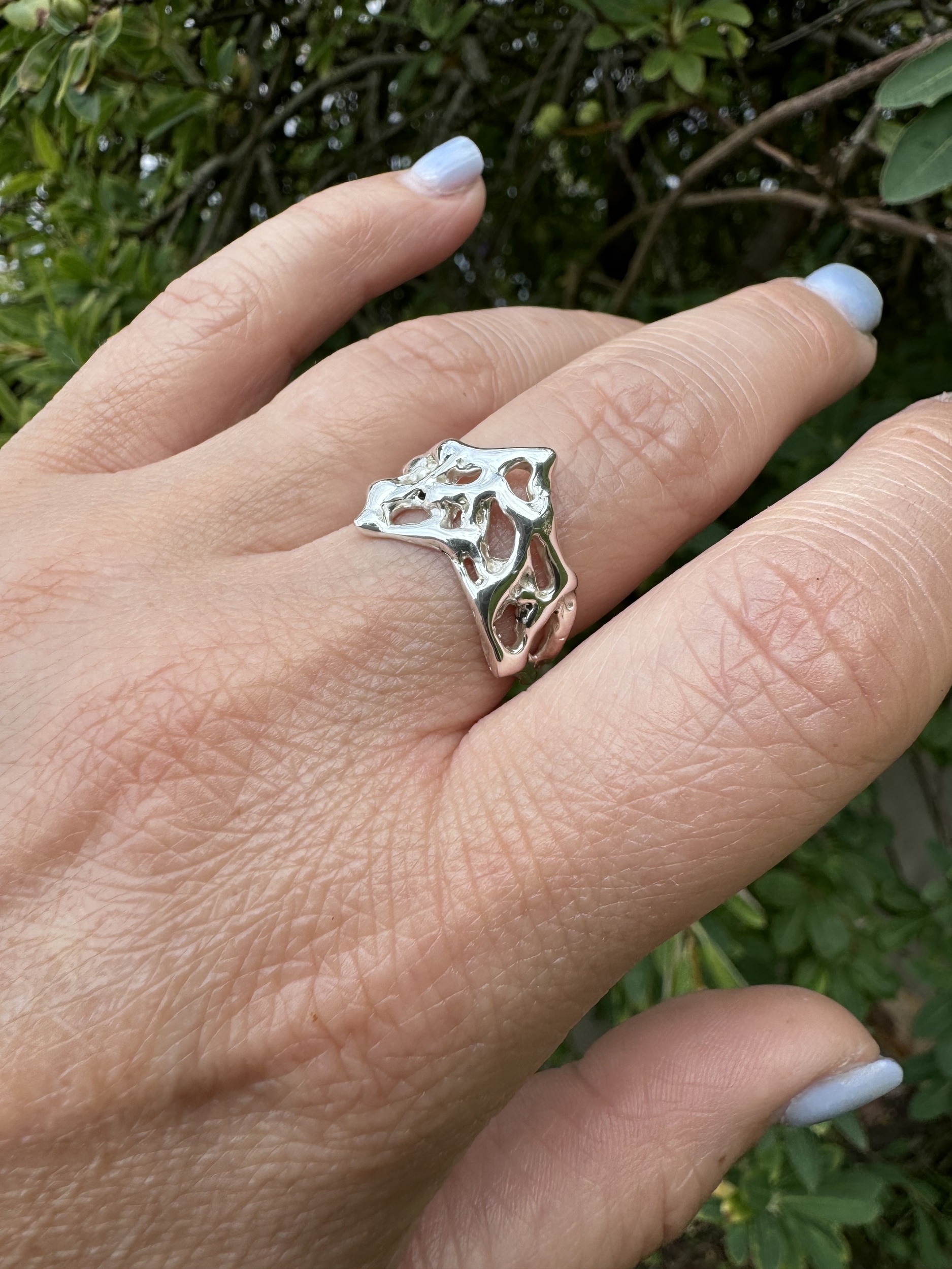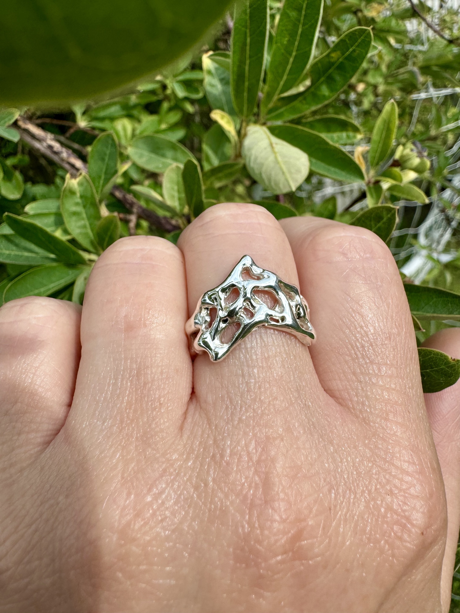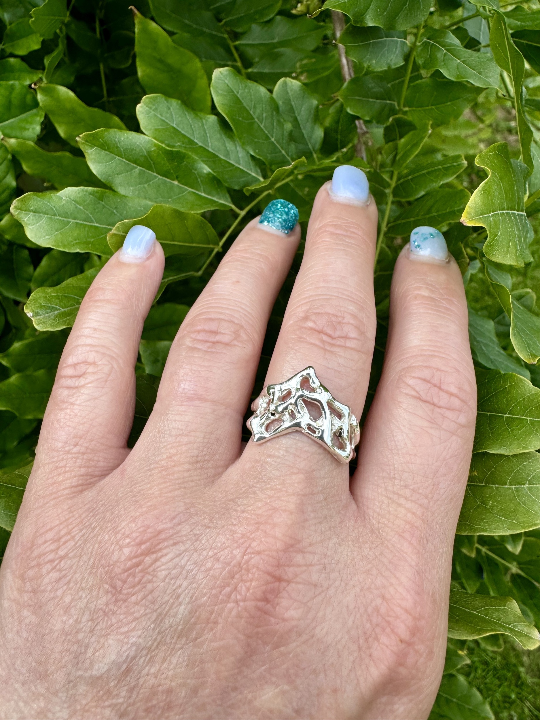 Molten lava 925 sterling silver wishbone ring , created in wax and cast using the lost wax method. This ring is available only in size N , if you have another size you would like your own unique molten lava ring.