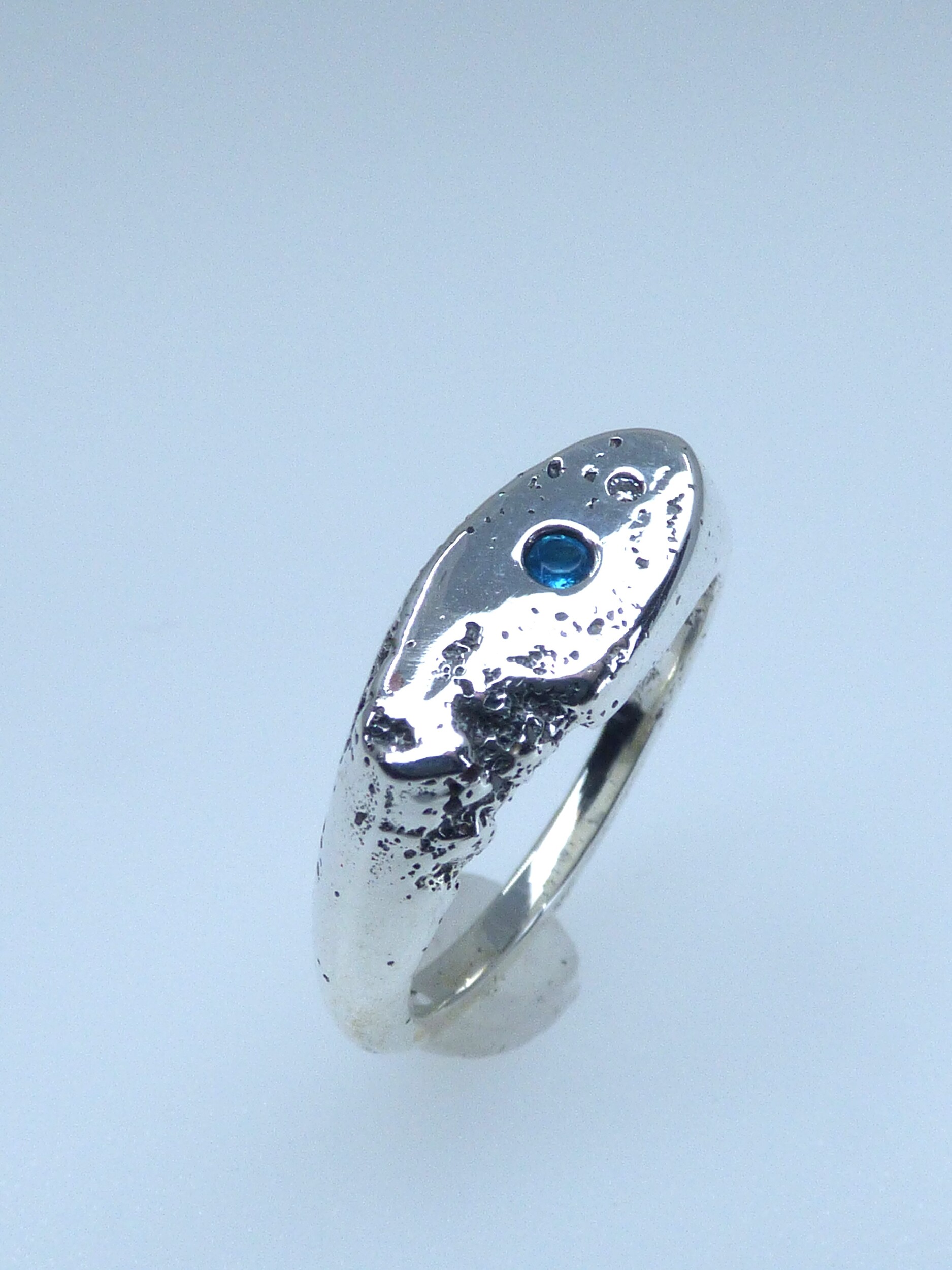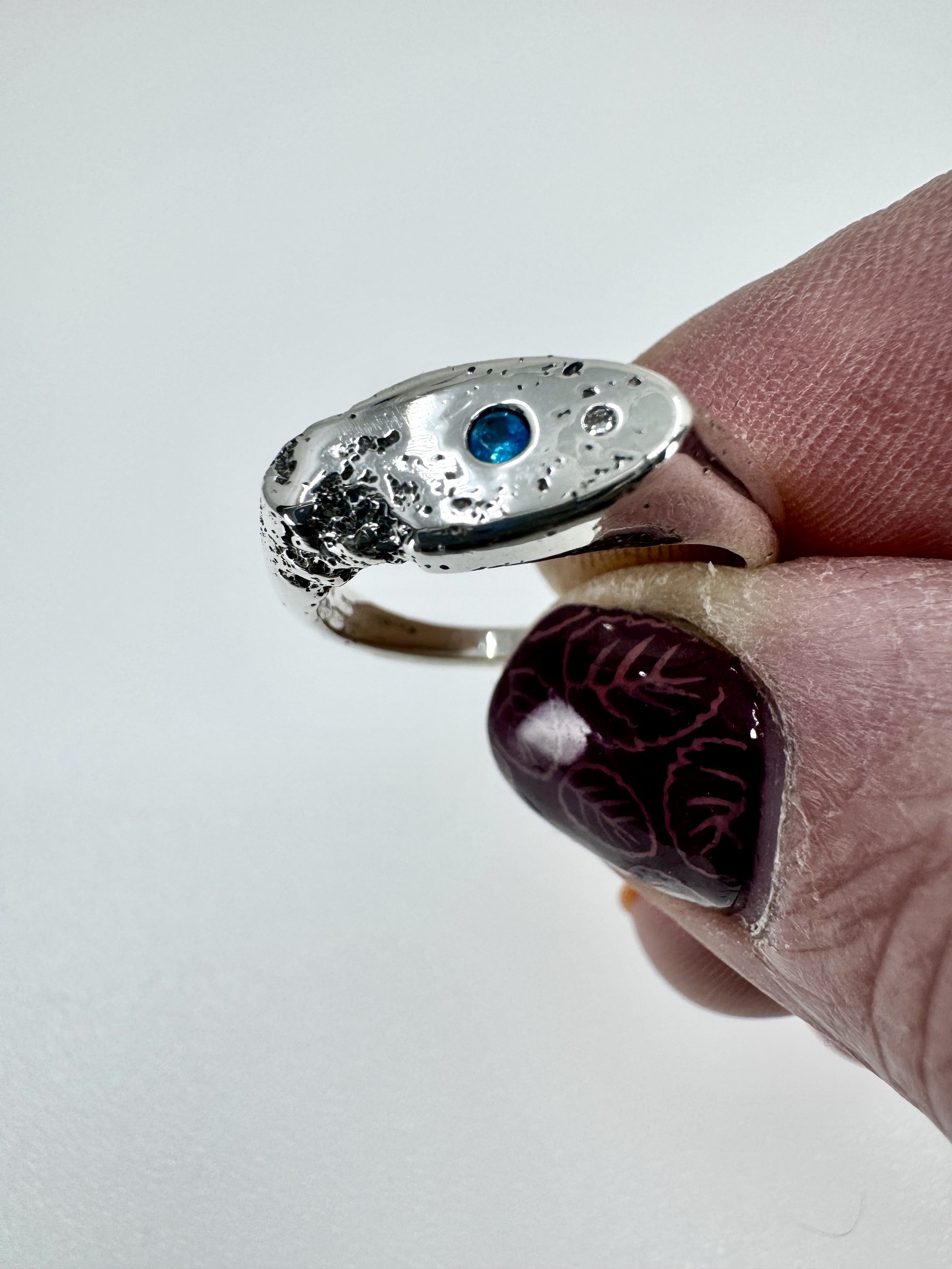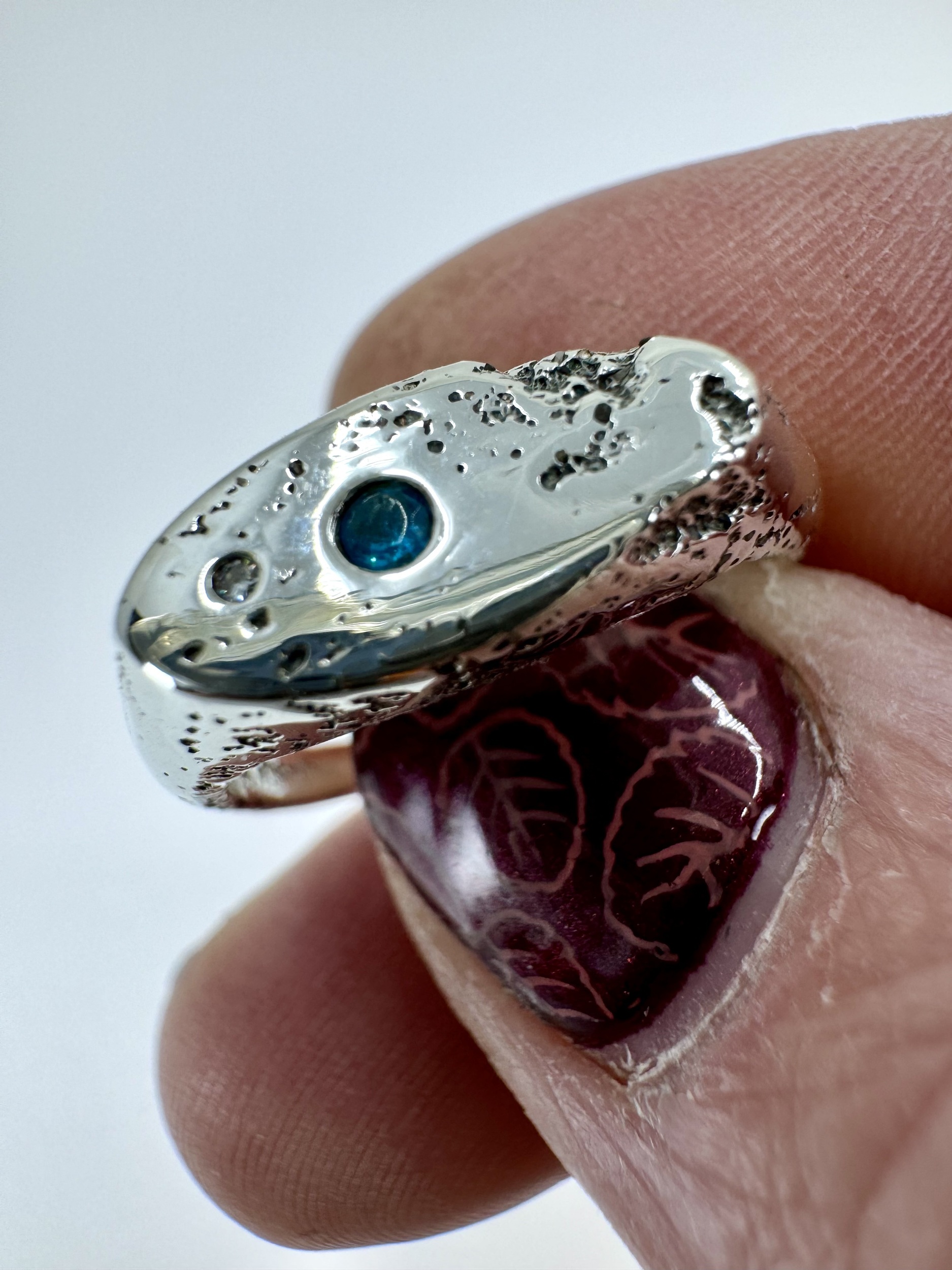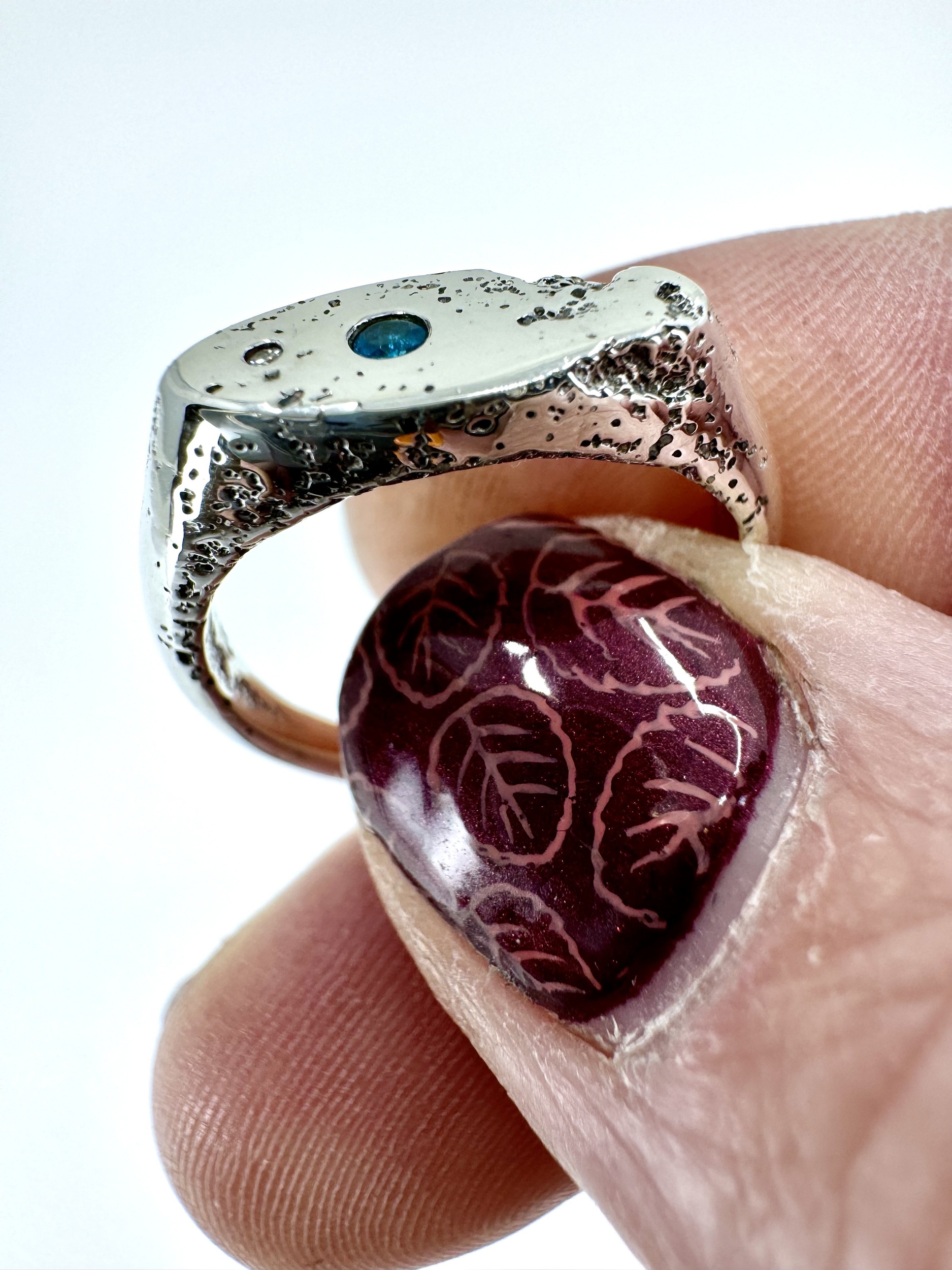This dainty textured rock pool signet is a one of a kind piece created using sand casting techniques finished, polished and decorated with beautiful Apatite and Peridot Gemstones.