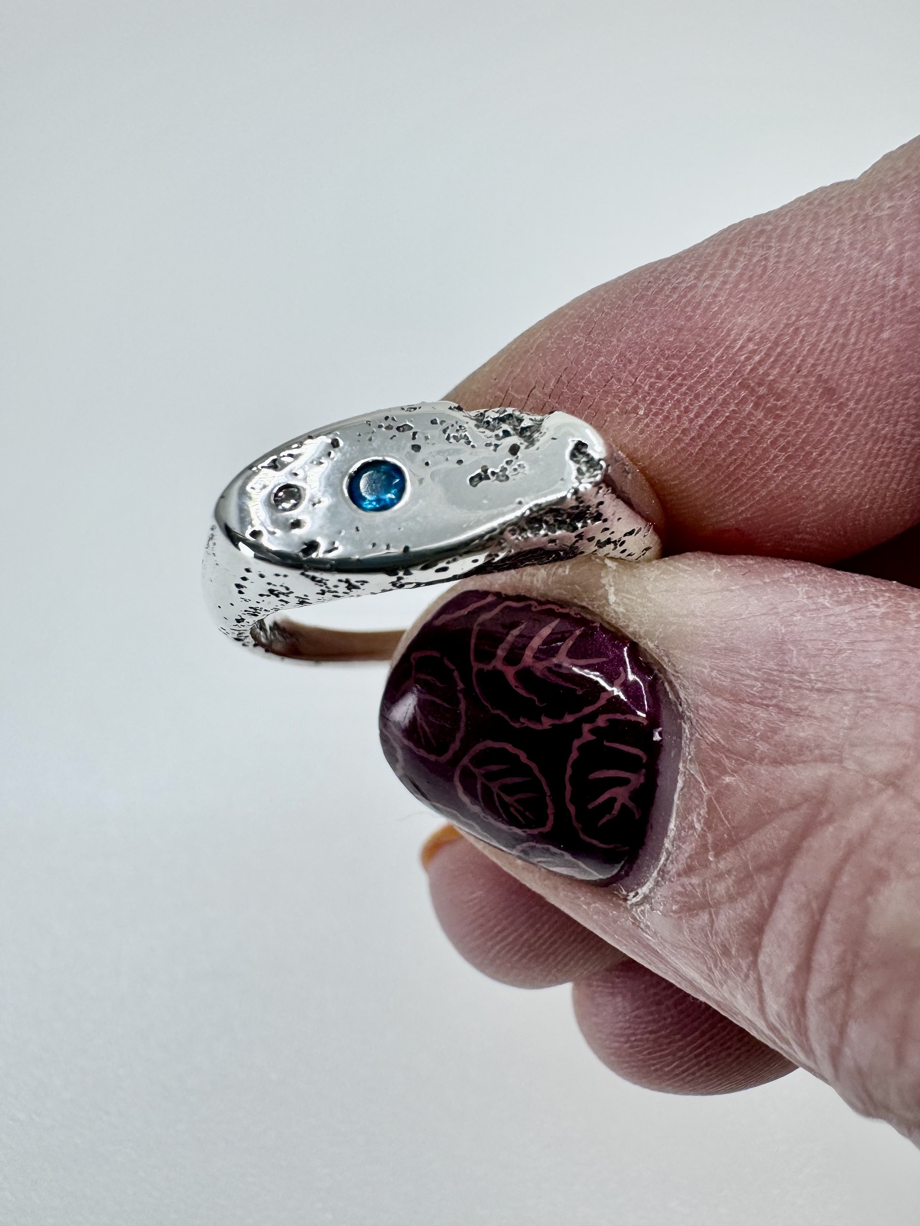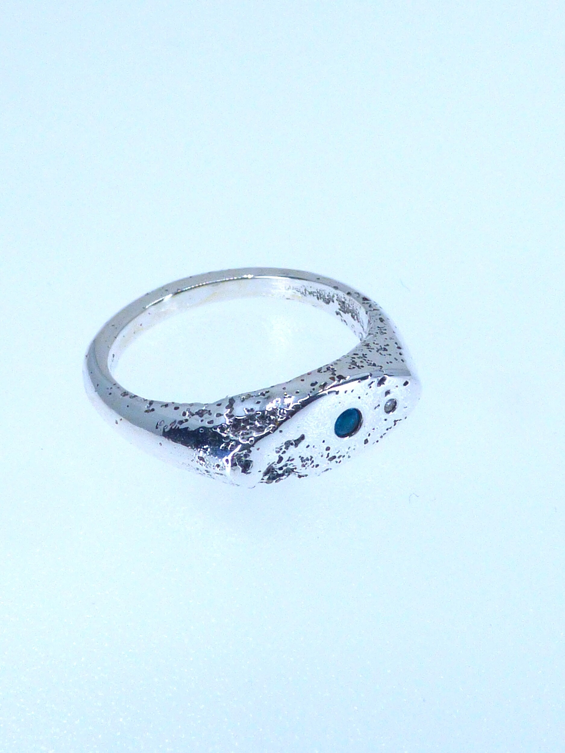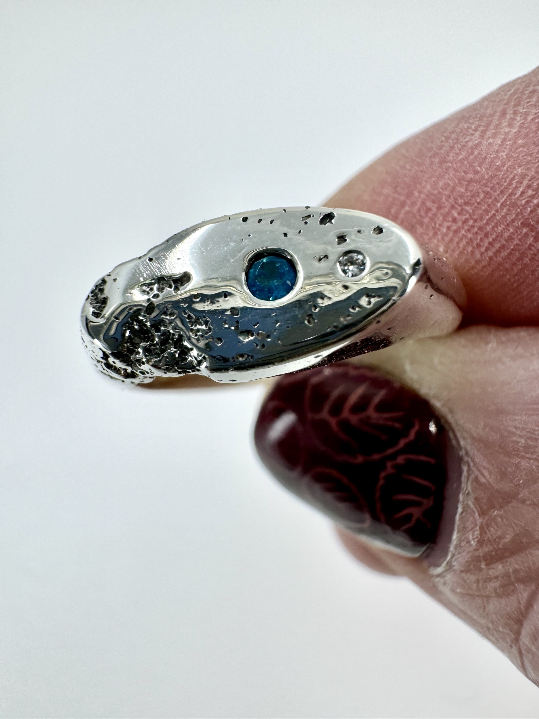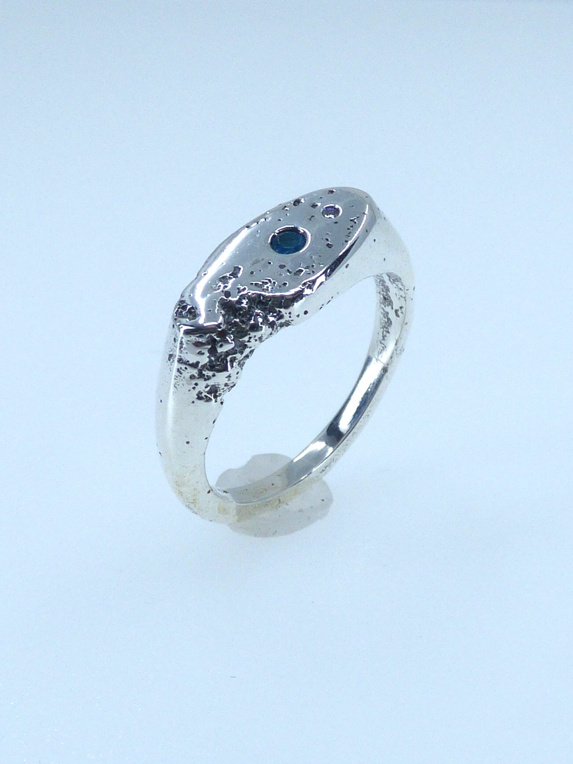 This dainty textured rock pool signet is a one of a kind piece created using sand casting techniques finished, polished and decorated with beautiful Apatite and Peridot Gemstones.