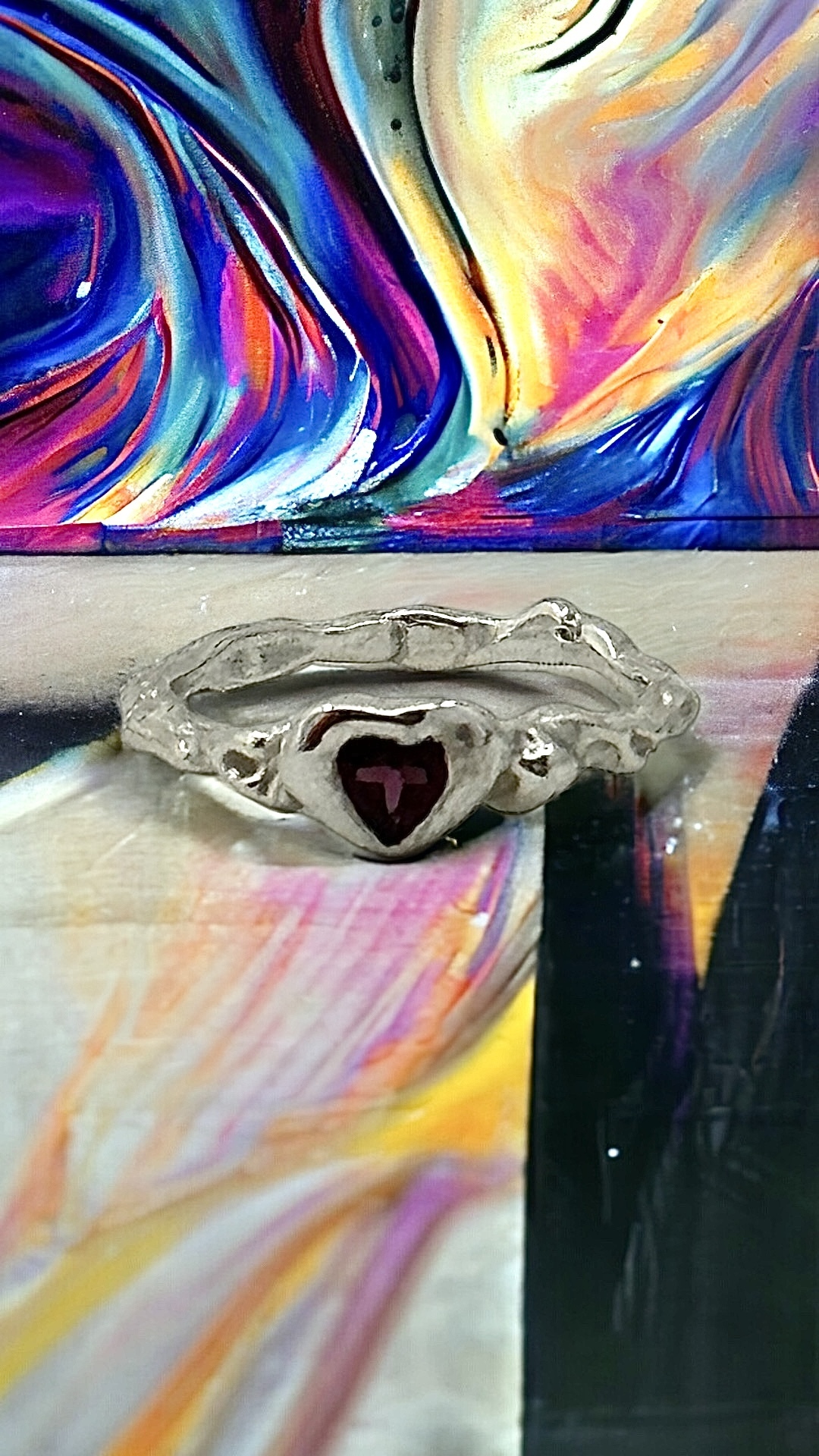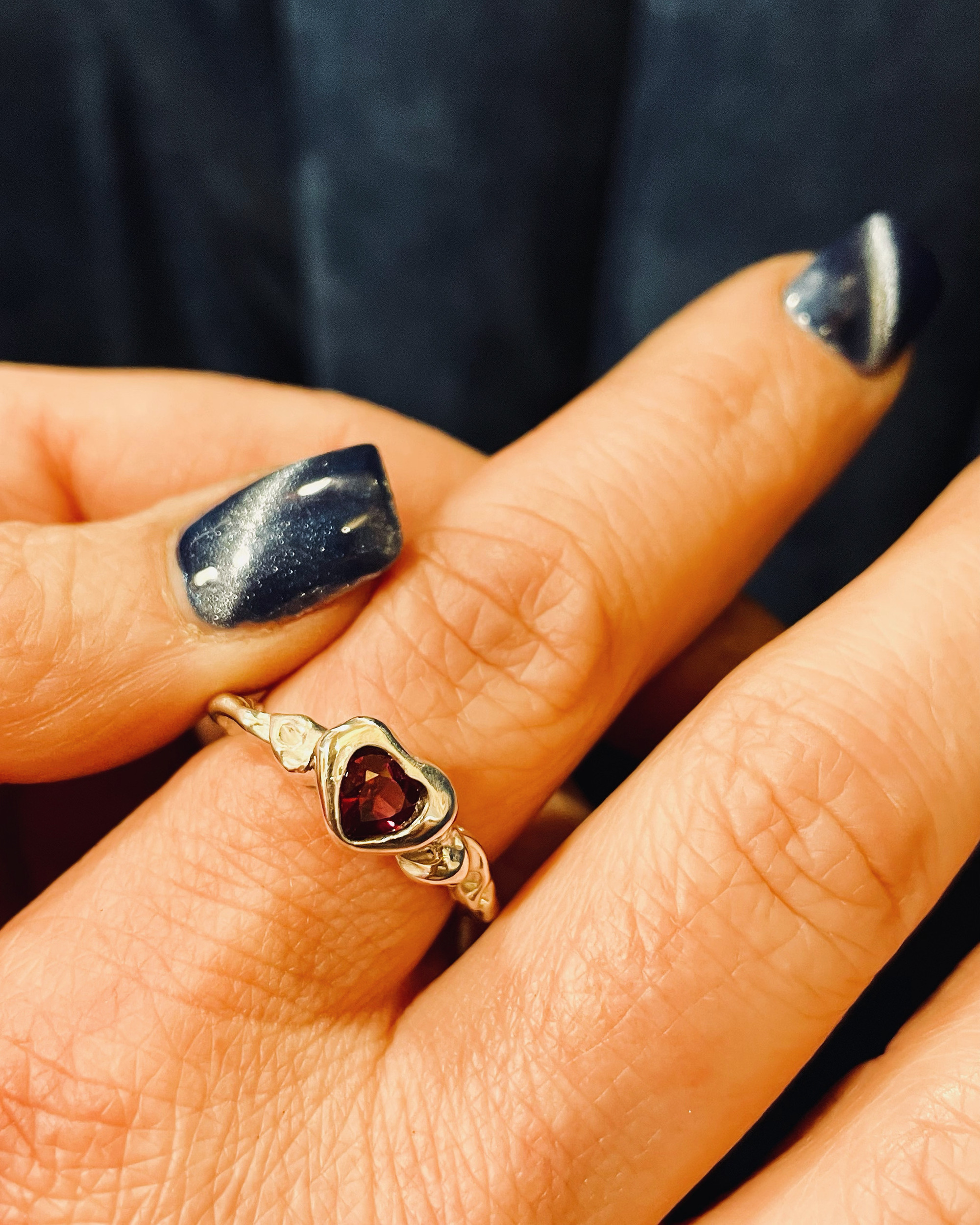 This Rhodolite Garnet gemstone heart is held in a loving eternal embrace in Molten lava 925 sterling silver , created in wax and cast using the lost wax method.