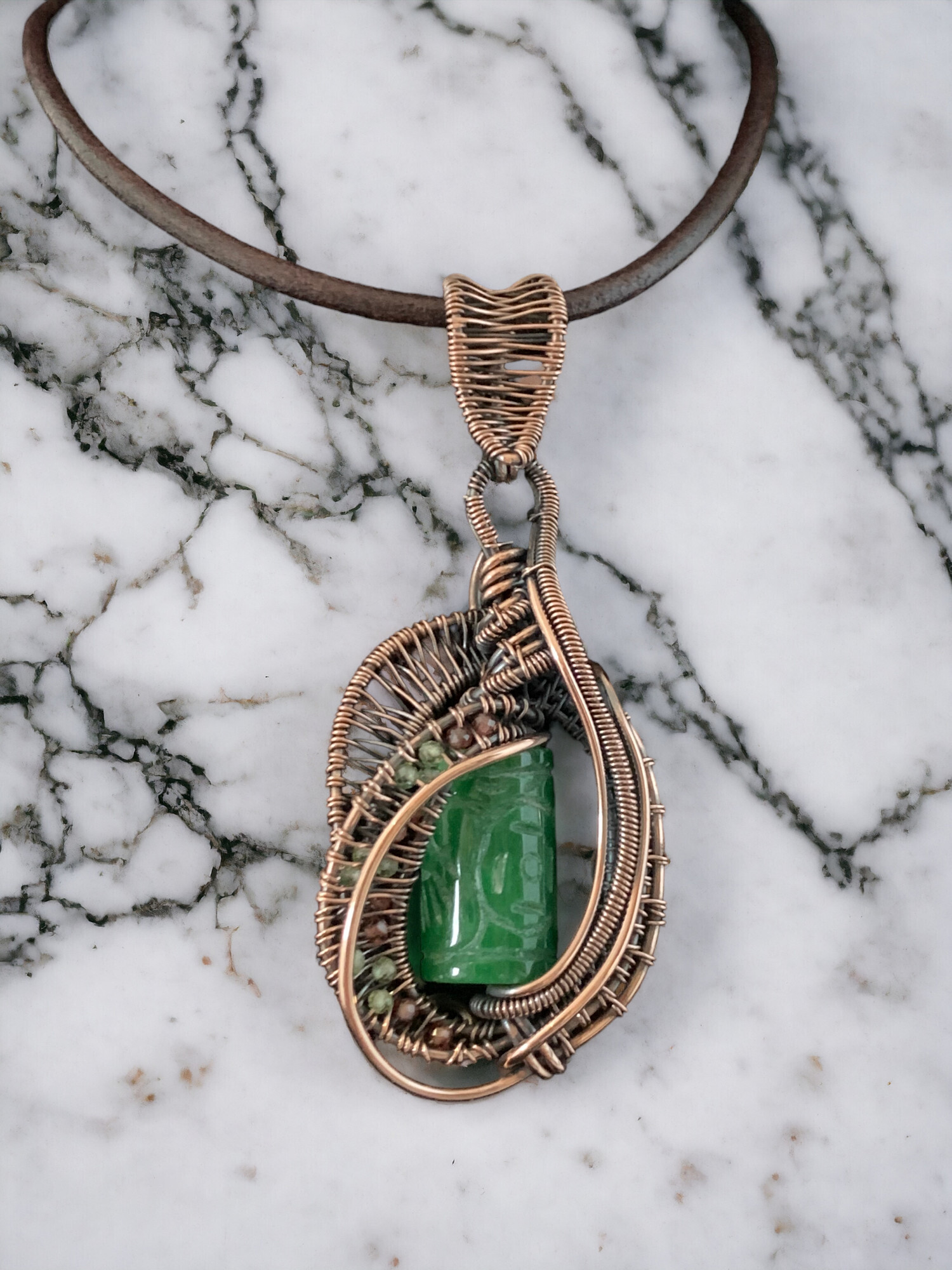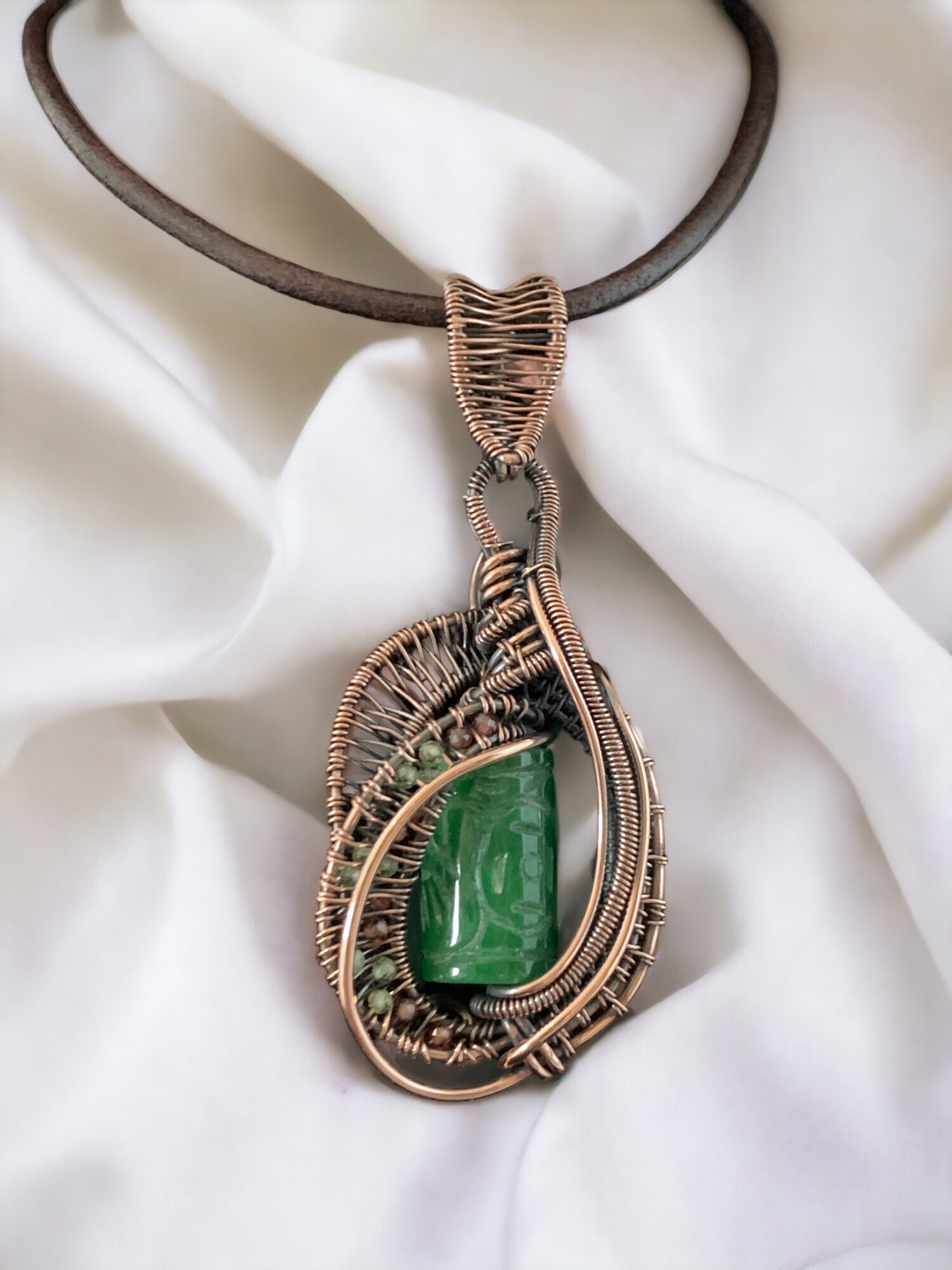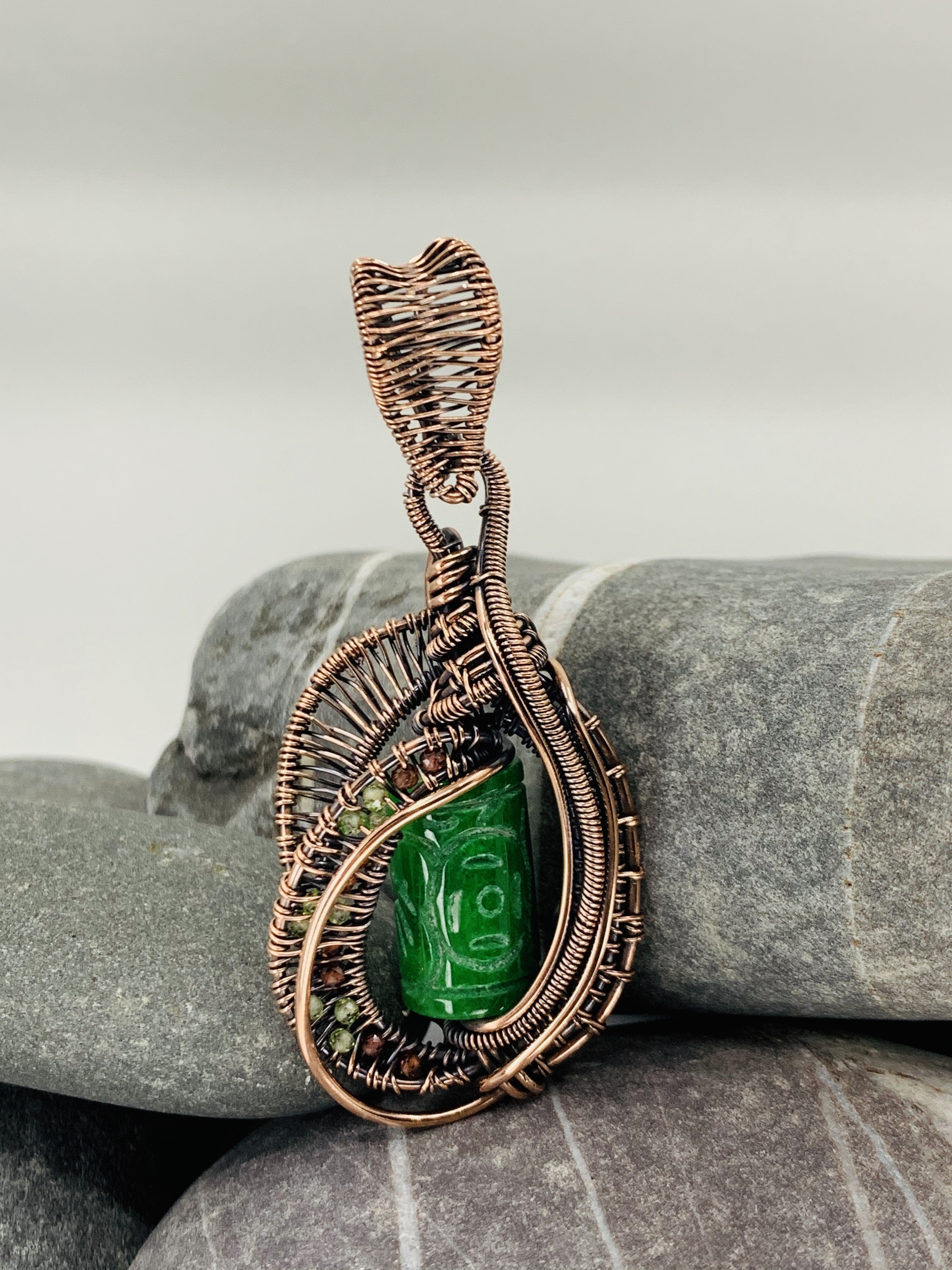 This beautiful Amulet Combines Natural Carved Jade Stone, Peridot, Garnet & Pure Copper in a beautiful Wire Weave Pendant.